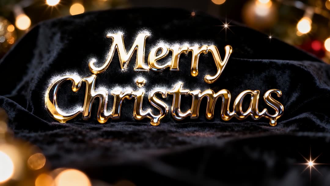 AI Generated Video. Video showing shifting lights revealing gold Merry Christmas script resting on black velvet, close-up capturing glittering edges, star flare highlights, warm bokeh glow. Slow camera pan or subtle zoom adding cinematic reveal while metallic lettering reflecting light and creating elegant contrast with dark fabric. Ideal for holiday greeting cards, social media reels, website banners, retail signage, luxury product promotions, festive commercial intros. Text overlay and logo placement working well with negative space at top and bottom for branding or message.
