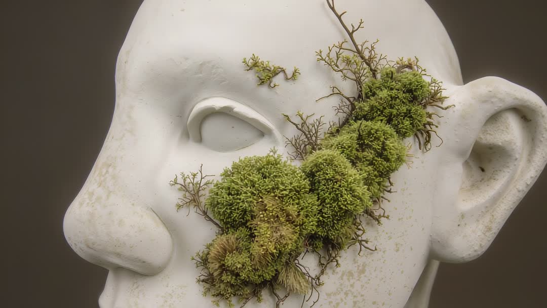 AI Generated Image. Video showing slow camera pan across white plaster sculpted bust, revealing vibrant green moss clusters and delicate twig stems creeping along cheek and ear. Close-up framing emphasizing texture contrast between smooth plaster and rough botanical growth, with soft studio lighting and neutral background creating minimalist mood. Visual mood conveying nature reclaiming man-made objects, passage of time, decay and renewal. Ideal for environmental campaigns, contemporary art promotions, gallery video loops, interior design mood clips, eco brand storytelling, beauty and skincare conceptual spots, editorial features about restoration and conservation, social media reels and background video for websites. Technical notes: landscape orientation, close-up left profile, shallow depth of field, macro detail on moss texture, muted neutral palette with vivid green accent. Licensing suggestions: film loop and hero visual for creative campaigns or educational content about ecology and art.