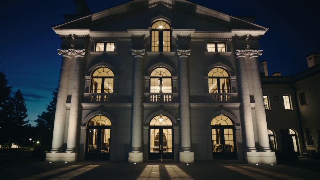 AI Generated Image. Footage showing neoclassical mansion facade at night, illuminated columns casting dramatic shadows across forecourt, camera pulling back to reveal full-height symmetry and grand entrance. Interior lights glowing through arched windows, creating warm contrast with deep blue evening sky. Scene capturing elegance, scale, and architectural detail including Corinthian columns, balustrades, and ornate pediment. Ideal for establishing shots in films, luxury real estate promos, hotel or resort branding, architecture documentaries, lifestyle commercials, and website hero banners. Pairing with ambient or orchestral soundtrack to enhance cinematic mood. Editing suggestions: apply letterbox crop for cinematic framing, color grade for cooler or warmer tone depending on desired atmosphere, add subtle camera speed ramp for dramatic reveal, or combine with aerial footage for comprehensive property showcase.