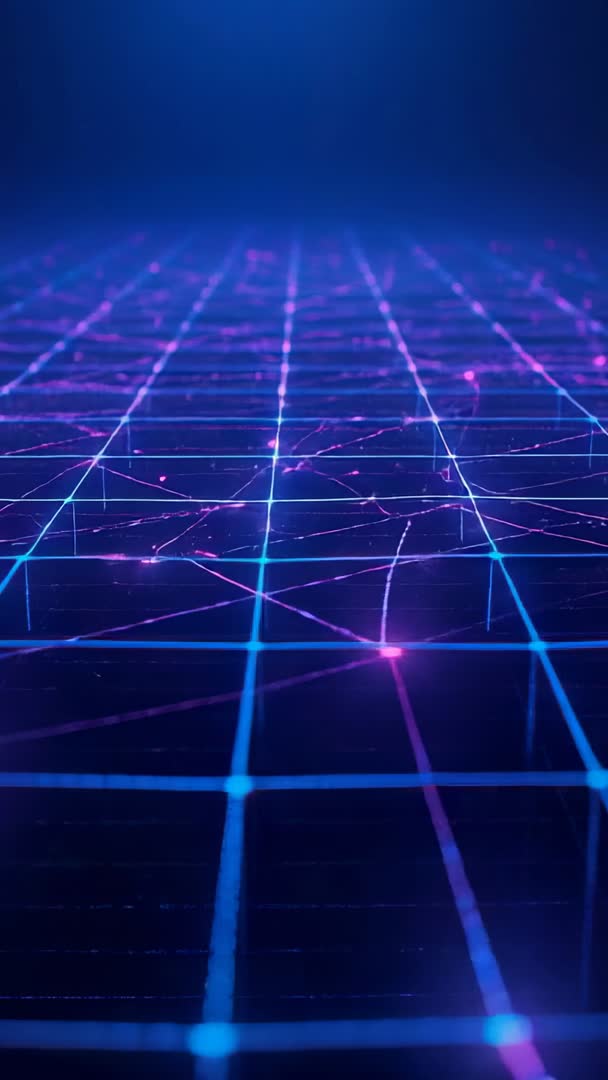AI Generated Image. Revealing neon grid stretching into void, pulsing nodes and glowing filaments tracing flowing data across deep blue plane. Offering vertical composition for immersive depth and continuous motion, with vibrant cyan and magenta highlights and subtle particle trails. Ideal for tech presentations, website hero loops, social media stories, app intros, conference openers, product demos, UI animations, and futuristic branding. Supporting seamless loop playback and easy integration into motion design projects, providing high-contrast backdrop for overlaying light text, logos, and call-to-action graphics.