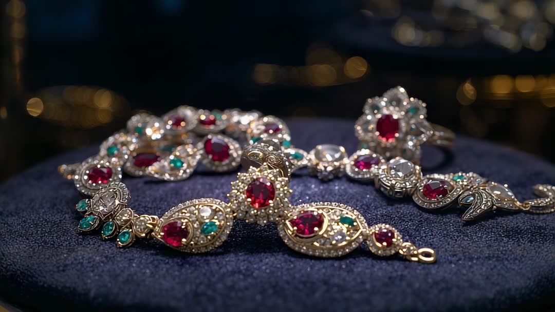 AI Generated Image. Slow camera gliding to reveal ornate ruby and emerald gold bracelet and matching ring resting on navy velvet pad under warm spotlight. Close-up focus shifting across filigree metalwork, faceted gemstones sparkling with bokeh lights in background. Lighting highlighting deep red rubies and green emerald accents against rich fabric texture. Video suitable for luxury brand promo, jewelry ecommerce showcase, auction catalog reel, social media ad, store window teaser, editorial feature. Editing suggestions: slow motion cuts, macro focus pulls, soft vignette, gentle camera parallax, subtle shimmer sound design. Color grading ideas: warm gold highlights, deep blue shadows to enhance gemstone contrast. Ideal for hero banners, product detail reels, promotional reels, printed catalog cover, online storefront, influencer content.