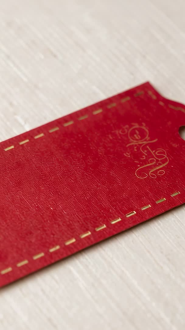 AI Generated Video. Footage showing red embossed cardstock gift tag with gold grommet being revealed by slow pan across light wood table. Camera moving from background to foreground while highlighting textured paper, stitched gold border and punched eyelet. Vertical framing optimized for mobile platforms and social channels with warm lighting and soft shadows creating premium mood. Usage suggestions: using as B-roll for gift wrapping tutorials, featuring as product detail clip for stationery and packaging brands, using as branding mockup for personalized tags or logo reveal, placing overlay text for holiday promotions and Instagram Reels, looping for background or lower-third accent in lifestyle videos. Technical notes: 9:16 vertical aspect, close-up macro focus, shallow depth of field, smooth pan motion. Color palette featuring crimson red and warm wood tones, working well with minimalist typography and subtle animation.