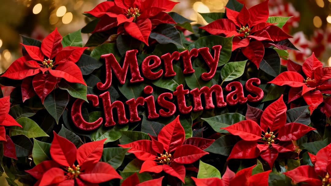 - Revealing Red Poinsettias with Embossed Merry Christmas Velvet Text and Warm Bokeh