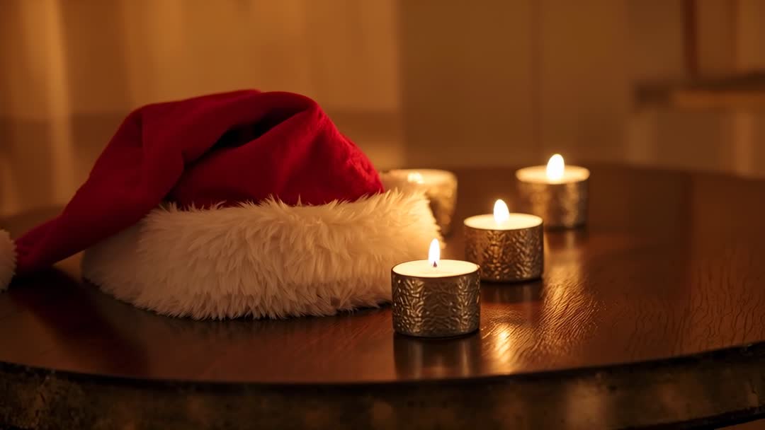 AI Generated Video. Shifting camera revealing red Santa hat resting on wooden table while three tealight candles are burning in foreground and casting soft reflections on polished wood. Warm amber light filling room, creating cozy festive mood and shallow depth of field isolating textured fur trim and flickering flames. Composition offering gentle negative space for text or title cards and cinematic feel suitable for short seasonal clips. Usage ideas: Working well for holiday video backgrounds, website banners, social media reels, email headers, greeting card animations, festive ad spots, candle brand promotions, seasonal blog intros, relaxation playlist visuals. Suitable for overlaying holiday greetings, promotional text, logo animation, or slow fade transitions. Technical notes: Low light, warm color palette, intimate close-up framing, shallow focus producing attractive bokeh and natural candle reflections.