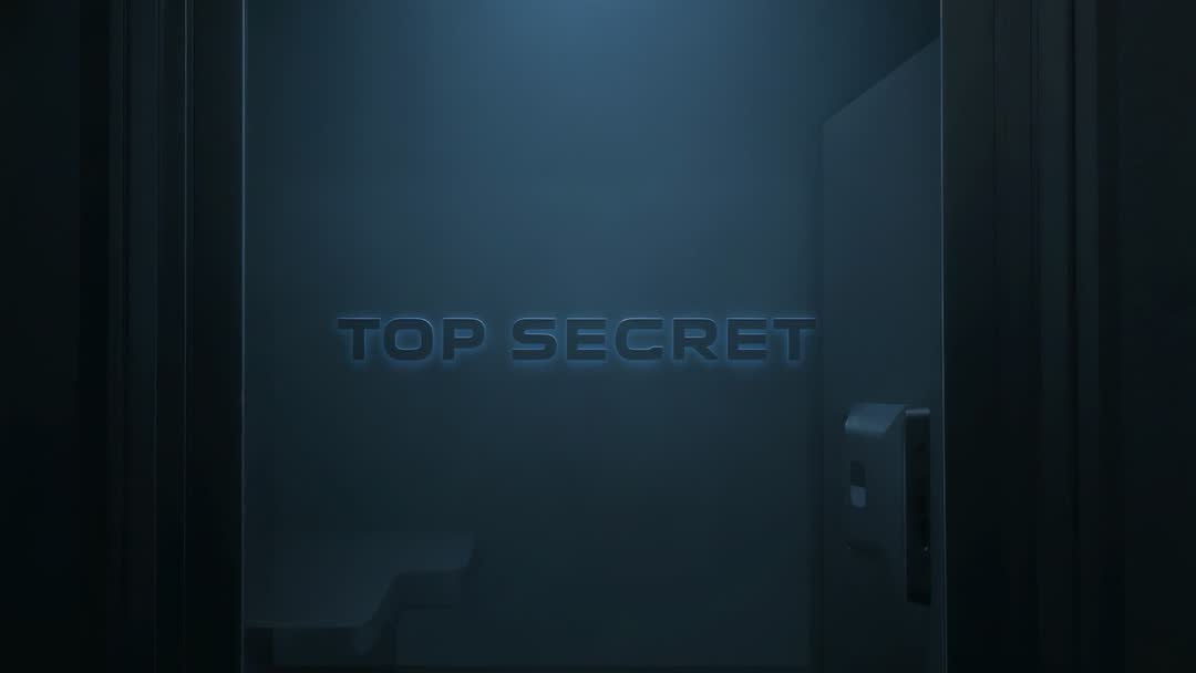 AI Generated Image. Overhead light revealing TOP SECRET lettering etched on frosted glass door in dim secure corridor. Camera panning slowly from left to right, highlighting keypad lock and faint silhouette behind glass. Atmospheric blue lighting creating tense, mysterious mood suited for thriller opener, corporate security drill, cybersecurity awareness content. Clip working well as background for title sequences, website hero banners, news graphics about leaks or classified information, training modules on access control, and promotional spots for security products. Multiple crop options available for widescreen and social formats. Color grading and sound design recommended to enhance suspense and cinematic impact.