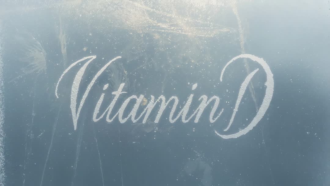 AI Generated Image. Showing delicate cursive Vitamin D being revealed on frosted panel by warm top light, dust specks and fine scratches adding tactile texture. Capturing macro typographic detail with soft blue-gray tones and subtle translucency, creating vintage, atmospheric mood. Serving well for health and wellness campaigns, supplement packaging, editorial about sunlight and nutrition, social media posts, web banners, pharmacy or clinic promotions. Offering clean area for overlaying headlines or animated dust for motion design. Providing close-up texture study for background layers, product ads, blog thumbnails, packaging mockups and lifestyle video intros.