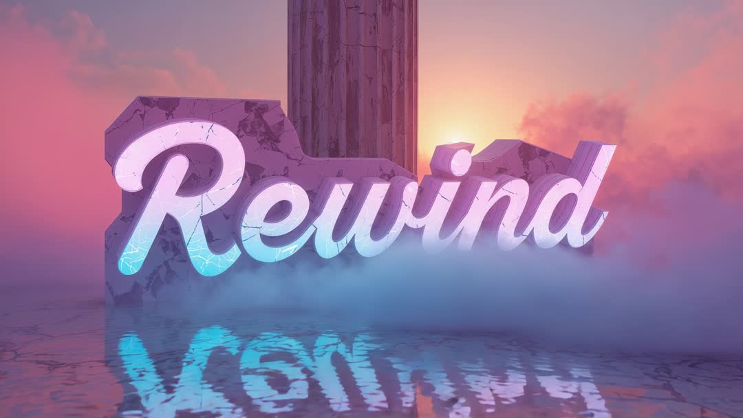 - Rewind marble script glowing at sunrise reflecting on misty water with pastel gradient