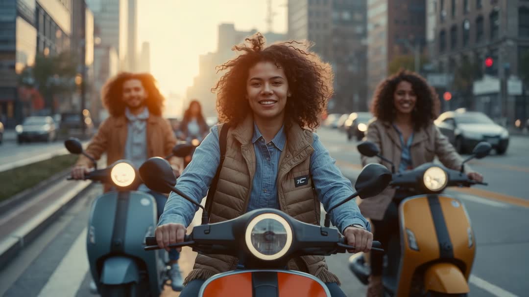 AI Generated Video. Video showing trio of friends riding scooters down urban street at sunset, lead rider on orange scooter smiling while camera tracking forward movement. Footage conveying energy, freedom, friendship, urban mobility, youthful lifestyle, and golden-hour warmth. Use for lifestyle advertising, urban mobility campaigns, social media reels, travel vlogs, website hero backgrounds, scooter or apparel promotions, tourism marketing, commuting storytelling, and diversity-focused editorial content. Technical notes: 16:9 framing, shallow depth of field, warm color grade, smooth forward tracking shot, natural lens flare and bokeh for cinematic feel. Suggest editing ideas: add cinematic music and upbeat tempo, overlay bold headline and call-to-action, create looping cut for short-form social, pair with messaging about community, eco-friendly transport, or weekend adventure.