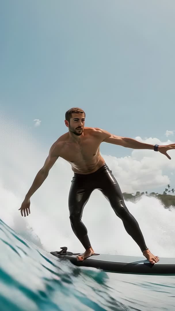 AI Generated Image. Showing shirtless male surfer riding powerful ocean wave, shifting weight and extending arms to maintain balance on surfboard. Captured in vertical video format, highlighting towering swell, breaking whitewater and spray with clear sky and distant coastline. Featuring dynamic motion, muscular athleticism and immersive low-angle perspective ideal for mobile-first content. Useful for surf brand advertising, action sports campaigns, travel and tourism promotions, fitness and lifestyle features, social media reels and vertical video ads. Recommended uses include hero header for mobile landing pages, Instagram Reels, TikTok clips, surf tutorial intros, magazine editorial on coastal adventure, and promotional banners. Composition leaving ample sky space for overlay text or logo, natural color grading for energetic summer mood.