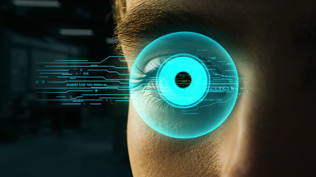 AI Generated Image. Short video clip showing close-up of right eye overlaid with cyan holographic HUD, concentric scanning rings and circuit-like data streams sweeping across iris. Blurred office background providing subtle corporate context and depth. Visual style combining high-detail skin texture with neon digital elements, creating dramatic contrast between human and machine. Camera lingering on micro-movements of eyelid while HUD elements pulse and data lines animate outward. Use for technology demos, biometric authentication presentations, cybersecurity and privacy editorial, AR/VR product marketing, sci-fi openers and title sequences, corporate training on access control, UI and UX showcase, website hero background and social media promos. Provide room for on-screen text or logo placement in left dark area of frame for branding or caption overlays.
