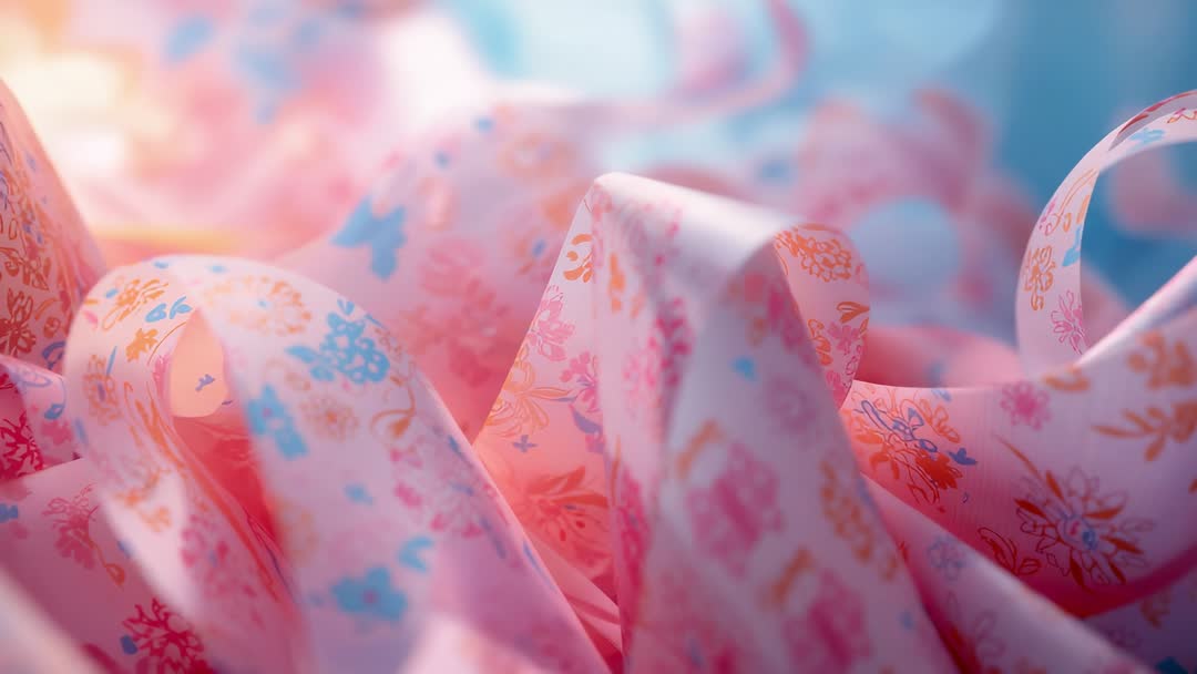 AI Generated Image. Animated sequence showcasing fabric with floral prints flowing in a gentle wave. The use of pastel pinks and blues adds a dreamy and calming effect. Rich in texture and movement, this digital art can represent themes like fashion, textile design, and interior decoration. It can be used in projects focusing on textiles, AI art creations, and abstract visual storytelling.