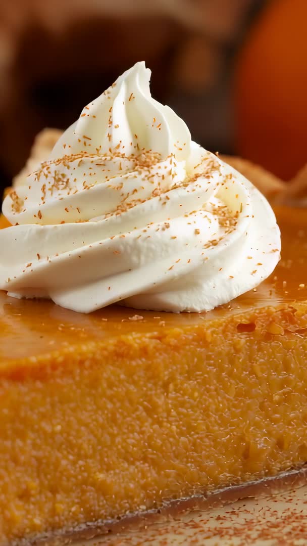 AI Generated Video. Vertical food clip showing rising camera revealing close-up of pumpkin custard slice topped with whipped cream swirl and cinnamon dust. Warm orange tones and shallow depth of field creating cozy autumn mood. Ideal for recipe reels, menu promos, Thanksgiving ads, seasonal social posts, and cooking tutorial intros. Add text overlay, soft acoustic music, and gentle slow motion to emphasize texture and aroma. Looping short clip working well for vertical ads, in-feed content, digital signage, and food blog hero sections.