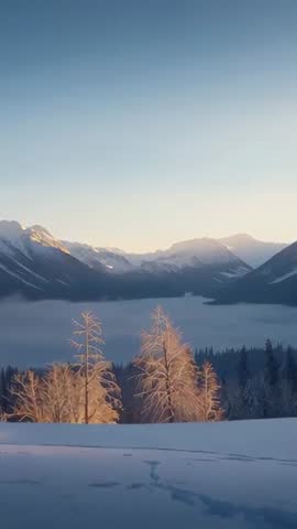 AI Generated Video. Vertical video showing rising camera movement from snowy foreground with footprints toward frost-coated trees and mist-filled valley. Mountain peaks and alpine lake emerging through low fog under soft golden sunrise light. Tall vertical framing providing ample sky area for overlay text, titles, or branding. Footage working well for travel promos, winter tourism ads, social media stories and reels, mobile hero banners, meditation and wellness clips, seasonal marketing, or editorial landscape content. Usage suggestions: add gentle ambient soundtrack or nature sounds, use slow crossfade and subtle parallax for cinematic feel, apply warm color grade to enhance sunrise tones, extract horizontal crop for banners while preserving vertical original for mobile. Licensing ideas: ideal for commercials, website hero video, social ads, travel videos, and stock footage libraries.