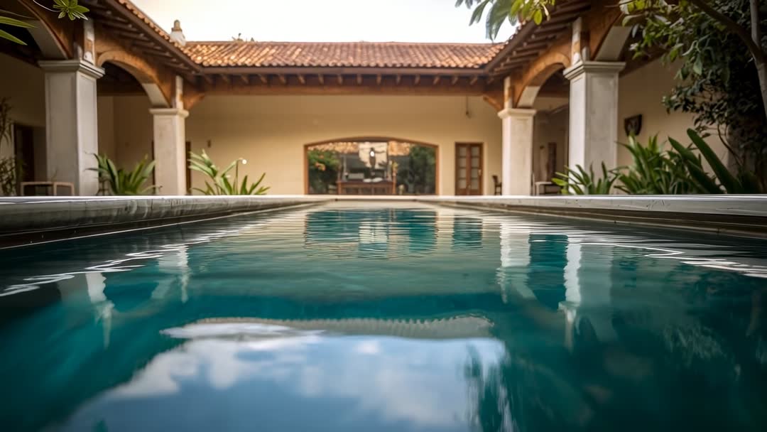 AI Generated Video. Rising camera moving slowly across turquoise pool water in villa courtyard, capturing reflections of columns and terracotta roof. Video showcasing arched doorway framed by lush greenery, offering low-angle cinematic perspective ideal for travel and lifestyle storytelling. Footage providing calm, luxurious atmosphere for hospitality promos, villa rental listings, real estate showcases, travel commercials, wellness and meditation content. Use as hero opener, B-roll background, or social media clip; pair with gentle ambient music and soft color grading to enhance warm terracotta tones and turquoise contrast. Editing tips: apply slow motion or subtle speed ramp for dramatic reveal, stabilize for smooth motion, add light ambient water sounds for immersive audio. Target audiences: travel marketers, real estate agents, architects, interior designers, content creators seeking elegant outdoor living visuals.