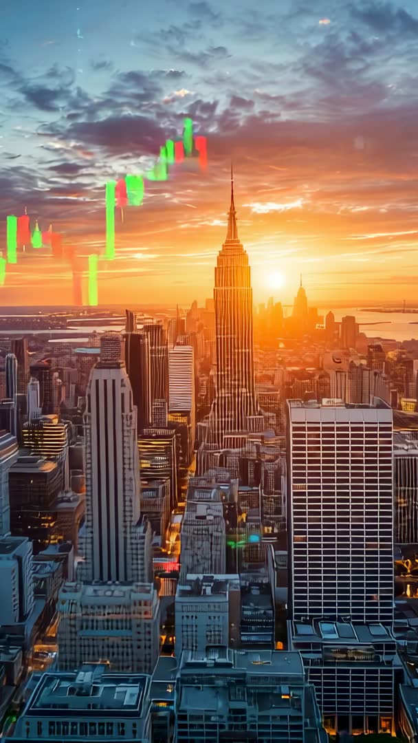 AI Generated Image. Vertical video showing candlestick chart rising across Empire State Building silhouette during vibrant sunset, blending financial data with iconic urban skyline. Warm golden light highlighting skyscrapers, creating dramatic backdrop for market growth and bullish trend storytelling. Serving financial news openers, trading platform promos, investment app intros, social media ads, corporate presentations, website hero sections. Suggestions for use: looping as mobile background, overlaying bold headlines and KPI graphics, adding soft ambient music or upbeat electronic track for dynamic energy, cropping for Instagram Reels and TikTok. Color grading options: enhancing warm tones for inspirational mood or cooling tones for sleek fintech branding.