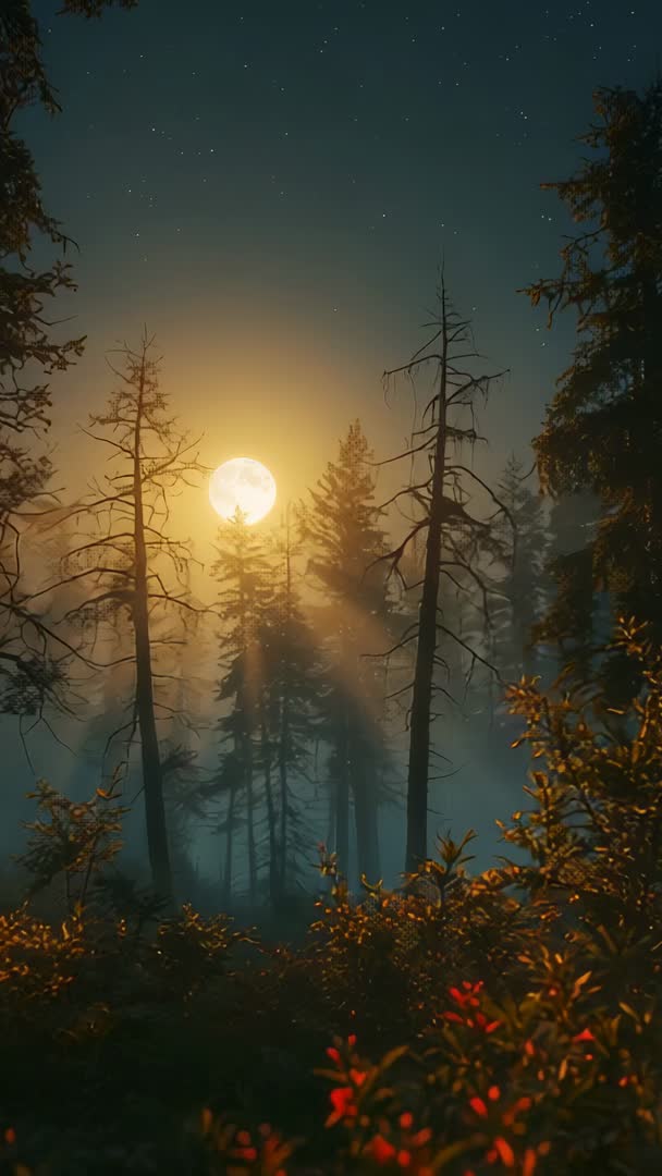 AI Generated Image. Vertical footage capturing rising full moon casting golden moonlight through misty conifer forest, creating dramatic moonbeams and silhouetting tall tree trunks. Red shrubs in foreground glowing with warm highlights while soft fog drifting between evergreens and stars peppering deep blue sky. Atmosphere feeling tranquil, mysterious and cinematic, perfect for conveying calm, wonder or suspense. Footage featuring vertical 9:16 composition, deep depth of field, soft bokeh on foreground foliage, warm backlighting and subtle haze. Working well for nature documentary intros, meditation and sleep app loops, vertical social media ads, travel and adventure promos, film title sequences, seasonal marketing, background loops for relaxation videos and smartphone wallpapers. Color grading suggestions: boosting warm tones to enhance moonlit glow and increasing shadow contrast to emphasize silhouettes.