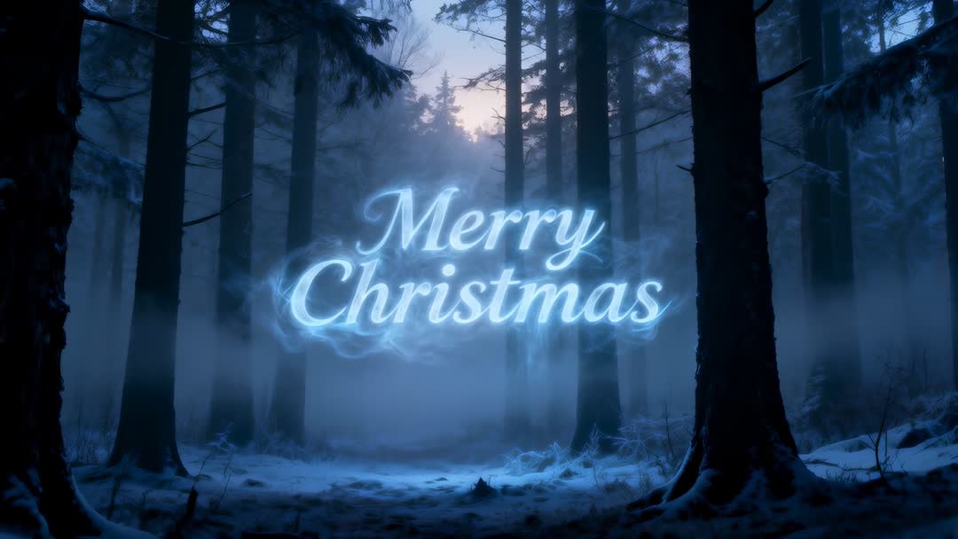 AI Generated Video. Showing glowing 'Merry Christmas' script rising through snow-covered pine forest at twilight, pulsing and casting cold blue light into low fog. Creating moody, cinematic holiday atmosphere with ethereal mist, deep shadows, and subtle rim lighting. Working as loopable motion background for seasonal campaigns, social media reels, website hero banners, TV promos, and digital greeting cards. Allowing easy customization by overlaying logo, changing text color, adjusting glow intensity, and adding festive music or chime sound effects. Ideal for brands seeking mysterious, elegant holiday visuals or for storytellers crafting winter fantasy scenes. Technical notes: loop length 6-12 seconds, 24-60 fps, deliverables in 4K and Full HD, alpha channel optional for overlay use.