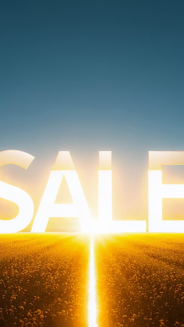 AI Generated Video. Vertical video showing rising golden beam highlighting SALE letters on horizon above blooming meadow at dawn. Bright backlit typography flooding field with warm golden glow, creating dramatic cinematic atmosphere. Serving promotional needs for seasonal sales, store openings, limited-time discounts, holiday campaigns, and social media ads. Providing strong vertical composition for Instagram Stories, Reels, TikTok, mobile banners, and in-store digital signage. Leaving generous top area for headline copy and lower area for call-to-action buttons or price labels. Offering color palette working well with white text overlays and bold brand colors. Offering licensing for commercial use across retail, e-commerce, marketing, event promotion, and broadcast.