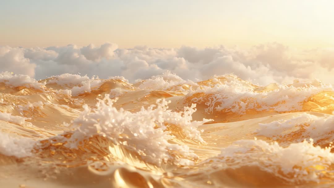 AI Generated Image. Short cinematic clip showing rising golden ocean waves cresting and breaking at sunrise, sunlight glinting on foamy spray and mist. Composition featuring shallow depth and dynamic motion, creating immersive foreground of rolling crests and luminous highlights. Suitable for background loops, website hero headers, travel and lifestyle promos, meditation and relaxation videos, luxury branding and environmental campaigns. Color palette offering warm golden tones for soothing mood or dramatic cinematic titles and overlay. Usage tip: extend clip by crossfade or speed ramping for seamless loop; combine with gentle ambient sound design or instrumental music for calming video backgrounds. Creation noted as AI generated; verify usage rights for commercial distribution.