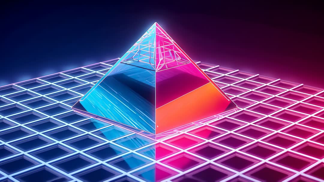 AI Generated Image. Video showing camera approaching rising neon pyramid resting on glowing grid, split cyan and magenta duotone reflections creating strong color contrast. Pyramid surfaces featuring glassy translucence and sharp prism highlights, interior wireframe geometry becoming visible near apex while subtle bloom and lens glow accentuating edges. Motion focusing on ascending approach and slow reveal, creating hypnotic, futuristic atmosphere. Working well as loopable background for music videos, electronic music visuals, VJ sets, streaming overlays, concert visuals, title sequences, and product launch reels. Serving as striking hero element for website banners, app intros, social media ads, album covers, and tech presentation slides. Offering clear negative space for overlaying text, logos, or UI elements; supporting color grading and speed adjustments for custom edits.