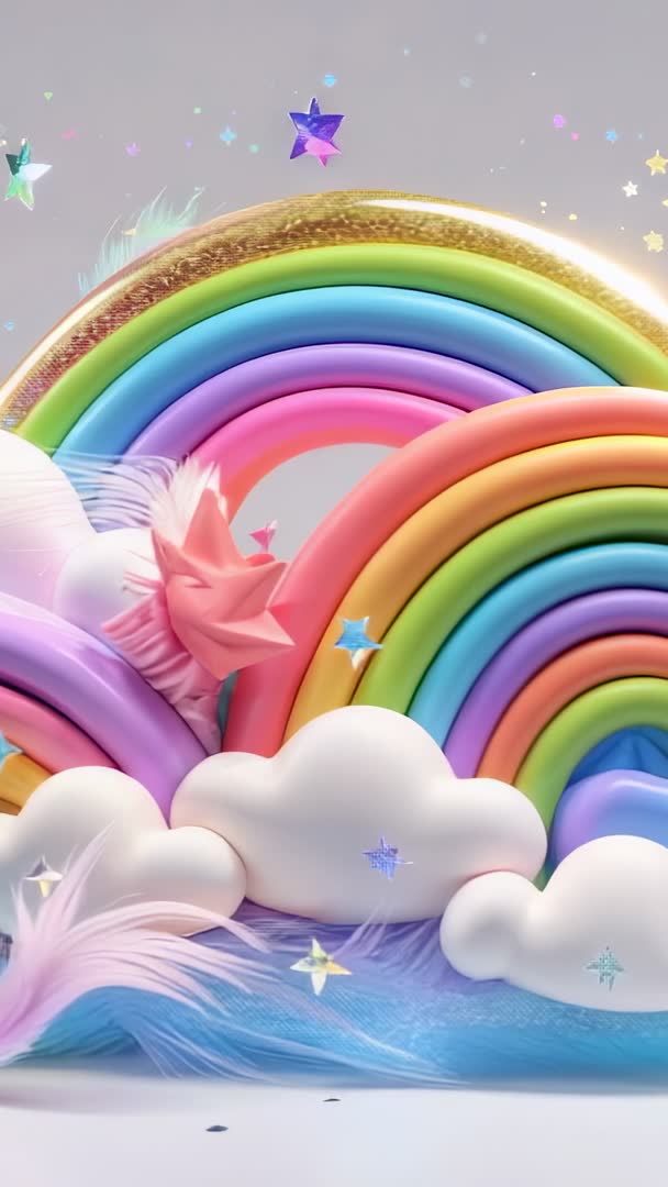 AI Generated Image. Featuring rising pastel rainbow sculpture, stars sparkling, liquid rippling over fluffy clouds and shimmering particles. Composed for vertical screens, optimized for mobile reels, stories, shorts and portrait ads. Working well for children's content, toy or beauty commercials, event intros, app launch sequences, title cards and mood backgrounds for wellness or fantasy themes. Leaving space for text overlay and logo reveal; consider looping for seamless background or slowing motion for cinematic feel.