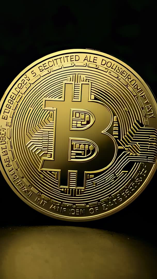 AI Generated Video. Video showing rising gold Bitcoin coin rotating clockwise toward camera over dark studio backdrop, lit disc highlighting intricate circuitry and embossed B symbol. Close-up framing delivering dramatic gleam, depth, and reflective metallic texture. Serving for financial news intros, cryptocurrency tutorials, blockchain presentations, fintech advertising, investor reports, and social media reels. Editors benefiting from slow-motion looping, text overlay for headlines, color grading for brand match, and animated lower-thirds. Vertical orientation optimizing display for mobile stories, reels, and app previews. Visual conveying digital wealth, market momentum, innovation, and secure transaction themes.