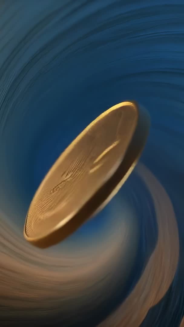 AI Generated Video. Featuring rising gold coin rotating inside reflective cylindrical tube, catching highlights and generating swirling reflections against deep blue backdrop. Offering vertical orientation and smooth spinning motion, making clip ideal for social media reels, Instagram stories, TikTok, and mobile-first ads. Serving as opener for finance, cryptocurrency, investment, banking, fintech, and luxury product campaigns. Functioning as loopable background for title cards, lower thirds, app demos, and website hero sections. Showing close-up metallic texture, crisp highlights, and cinematic lighting for premium aesthetic. Allowing easy text or logo overlay and color grading for brand matching. Supporting slow-motion ramps and seamless looping for dramatic reveal or continuous motion.