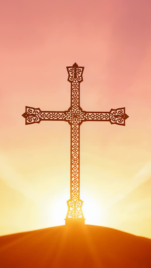 AI Generated Image. Vertical video capturing rising sun backlighting ornate cross silhouette on hilltop, producing glowing halo and cinematic lens flare. Warm orange gradient sky and detailed latticework of cross creating dramatic spiritual atmosphere. Serving as ideal asset for church service intros, Easter and Good Friday promotions, worship livestream backgrounds, sermon title sequences, faith-based social media reels and inspirational video content. Using slow zoom or subtle parallax for enhancing motion, adding soft cinematic music and minimalist text overlay for scripture or event details. Serving as loopable background for stage projection, mobile worship apps, website hero videos, greeting card animations and memorial tributes. Applying warm gold color grade and gentle vignette for increasing focus on cross silhouette.