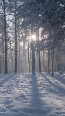 AI Generated Video. Showcasing rising sun peeking between tall conifer trunks, casting long rays through mist and lighting soft powder snow. Deep shadows stretching across textured snow creating leading lines toward central sunbeam. Atmosphere feeling crisp, quiet, cinematic with cool blue tones and subtle lens flare. Useful for winter travel promos, holiday greetings, nature documentaries, meditation and wellness videos, social media reels, website hero banners, mobile ads. Working well as vertical B-roll for portrait-first platforms, background for inspirational quotes, seasonal marketing, weather segments, environmental storytelling. Color grading suggestions: boosting contrast slightly and preserving cool highlights to maintain frosty mood.
