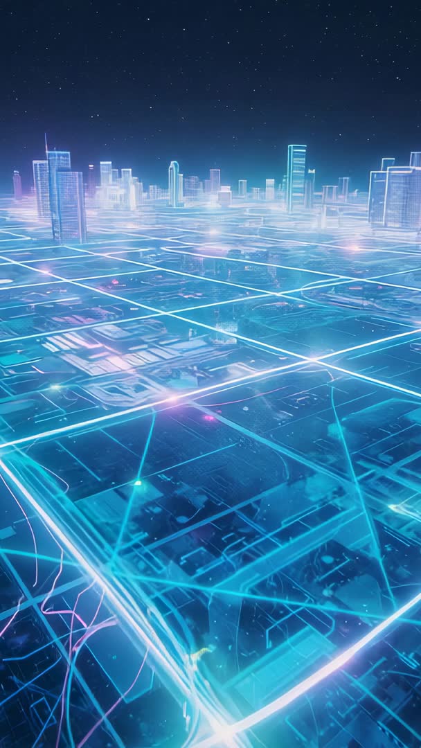 AI Generated Image. Vertical sci-fi sequence showing camera rising from neon grid plane into glowing skyline, featuring pulsing light nodes, intersecting data lines, and floating holographic towers. High-energy visual mood combining cyberpunk color palette, electric blues and magentas, and deep night sky sprinkled with stars. Providing striking opener for tech product promos, blockchain explainers, urban mobility concepts, virtual city tours, and futuristic brand commercials. Suitable for social media vertical ads, mobile backgrounds, pitch decks, website hero loops, broadcast bumpers, and conference visuals. Editable for overlaying titles, animated logos, or data visualizations; color grading and speed ramping supporting mood variations. Perfect for illustrating concepts such as smart city infrastructure, data flow, connectivity, AI networks, and metaverse navigation. Duration suggesting single vertical video pull-up through grid with loopable potential for background use.