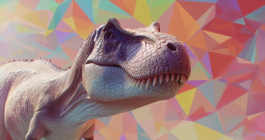 AI Generated Image. This captivating video scene captures a realistic CGI representation of a Tyrannosaurus rex transitioning from a roaring posture to a calm stance. The backdrop of vibrant geometric patterns enhances its futuristic feel. Ideal for educational projects, animation shorts, museum displays, and entertainment media focusing on dinosaurs or natural history.