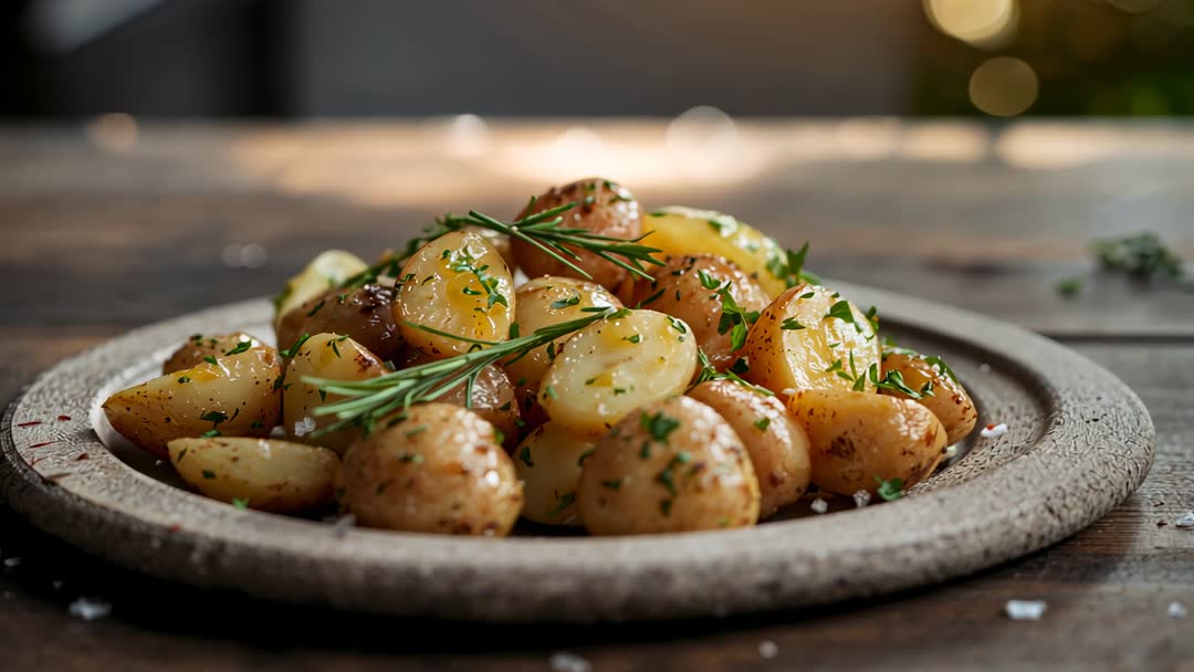 AI Generated Video. Pulling back camera to reveal roasted baby potatoes piled on rustic ceramic plate, garnished with rosemary sprig and chopped parsley, glistening with olive oil and sea salt. Warm golden light and shallow depth of field creating soft bokeh background, conveying cozy farmhouse meal mood. Shot working well as opening scene for recipe video, step transition for cooking tutorial, or product showcase for cookware or seasoning brand. Use for food blog hero clip, social media reels, restaurant menu loop, holiday dinner promotion, farm-to-table marketing, cookbook background. Suggest editing ideas: start with tight close-up then slow dolly out, add ambient kitchen sound, layer soft music, apply warm color grade, add text overlay for recipe title or ingredient list.