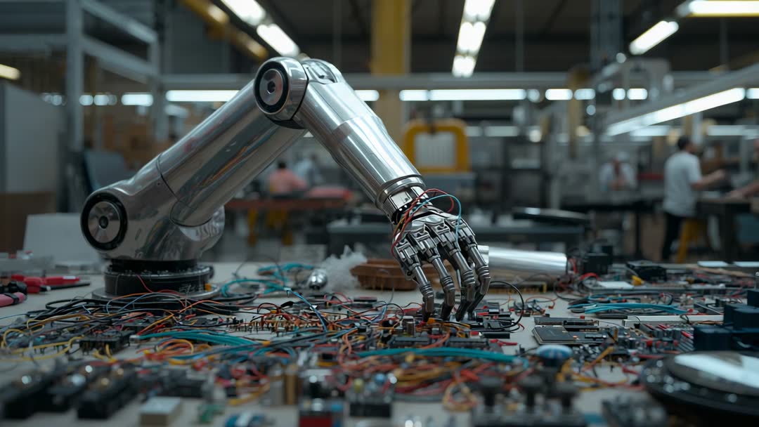 AI Generated Image. Sleek metallic robotic arm lowering articulated hand to probe densely wired printed circuit boards on cluttered workbench. Close-up focusing on manipulator fingers, multicolored wires, and contact probes while background factory activity remains softly blurred. Footage conveying precision electronics testing, PCB assembly prototyping, and automated quality control workflows. Useful for illustrating industrial automation, robotics research, electronics manufacturing, and engineering training. Perfect for corporate presentations, product demos, technical tutorials, website hero banners, trade show reels, and documentary segments. Editing suggestions include slow-motion close-ups for emphasis, overlaying schematic graphics for educational use, and combining with voiceover explaining pick-and-place and testing procedures.