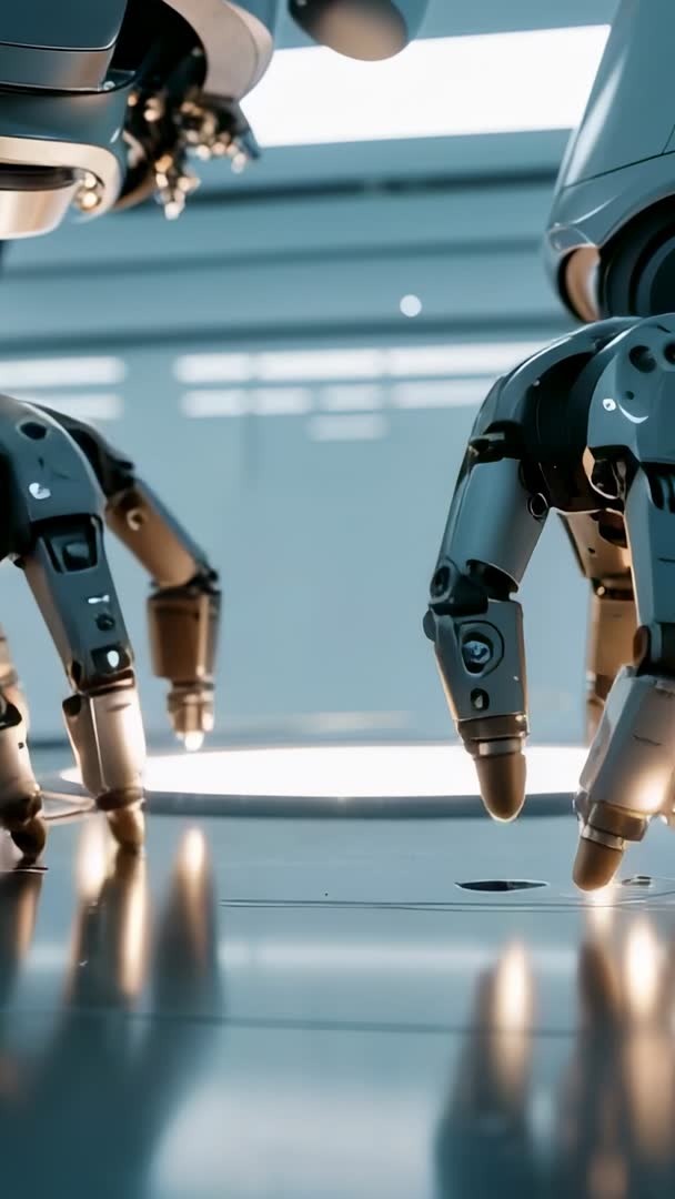 AI Generated Image. Close-up vertical video showing robotic arms flexing metal fingers and probing indentation on stainless tabletop under cool lab lighting. Mechanical joints moving with precise, calibrated motion while sensors delivering tactile feedback and control systems adjusting micro-positioning. Shallow depth of field creating reflective highlights and technical atmosphere. Footage working well for technology marketing, industrial automation tutorials, engineering case studies, product launch reels, vertical social media ads, and startup pitch decks. Footage suitable for background plates in presentations, hero banners for robotics companies, cinematic B-roll for documentaries about AI and advanced manufacturing. Footage editable for slow-motion analysis, frame-by-frame inspection, overlaying graphics, and text callouts to illustrate sensor data or workflow. Color grading options recommending cold blue or high-contrast cinematic looks to enhance futuristic mood.