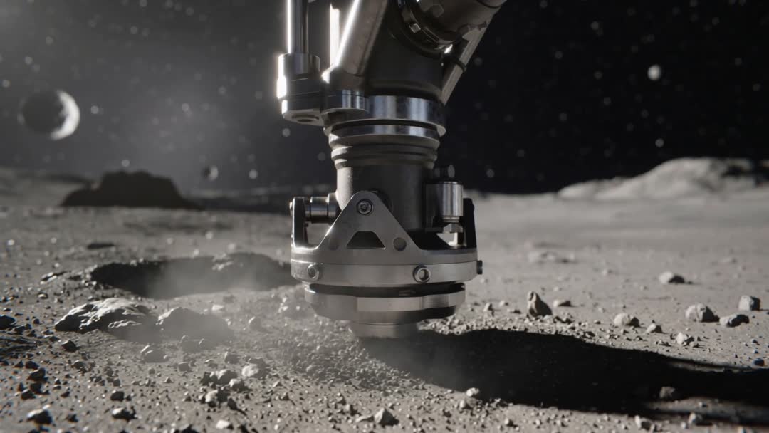AI Generated Image. Video showing robotic drill descending toward Moon surface, contacting regolith and excavating sample while stirring dust plume. Close-up of metallic end effector disturbing fine granules near small crater, starfield and distant celestial body appearing in background. Cinematic low-angle composition highlighting mechanical detail, soft shadowing and high-contrast monochrome palette, suitable for slow-motion or time-lapse edits. Useful for documentary or news segments about lunar exploration, mission planning presentations, aerospace technology marketing, educational videos about planetary science, and sci-fi film sequences. Works well as establishing B-roll, cutaway or hero close-up for immersive storytelling. Metadata suggestions: tag with Moon, regolith, drilling, robotic arm, sample collection, dust plume, crater, space exploration, engineering, 3D render, video footage.