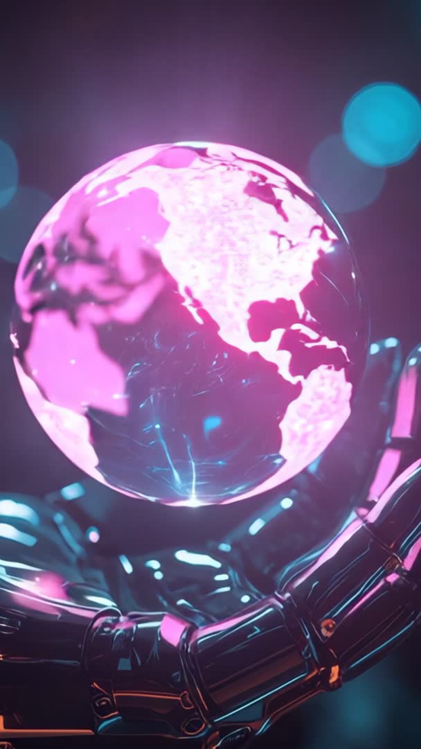 AI Generated Image. Vertical video showing robotic hand holding rotating holographic globe visualizing data flow with neon pink and cyan glow. Composition creating futuristic cyberpunk mood and emphasizing themes of AI, connectivity, and global networks. Ideal for tech company promos, AI product launches, cybersecurity campaigns, data analytics presentations, and mobile app splash screens. Useful as background for social media reels, vertical ads, website hero sections, conference openers, and instructional videos about IoT and big data. Recommended enhancements: add subtle particle trails, lower thirds, or title overlays to improve storytelling and loopability for short-form content.