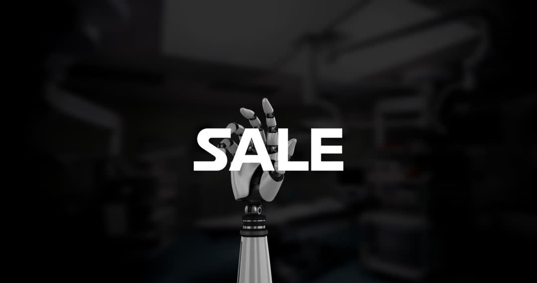 Animation featuring sale text with silhouettes of shapes over a prominently-displayed robotic hand. Provides a futuristic and advanced feel, suited for promotions and advertising in technology and innovation sectors. Useful for e-commerce websites, digital marketing campaigns, and tech product launches.