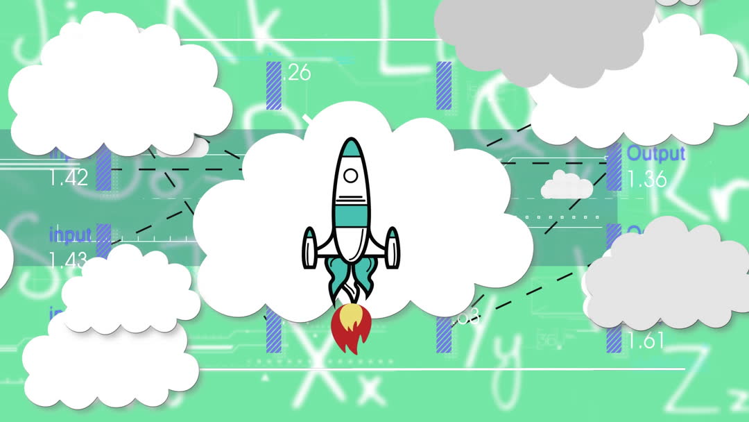 Illustration shows a stylized rocket launching amidst digital data symbols and cloud graphics. Set against a turquoise background, this video symbolizes innovation, technology advances, and data processing, suitable for education, tech promotional material, or articles on data transformation and digital advancements.