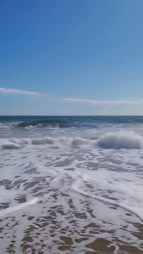 AI Generated Video. Vertical 9:16 clip showing rolling surf pushing onto sandy shoreline, white foam patterns spreading across wet sand, distant horizon sitting under clear blue sky. Gentle horizon swell creating rhythmic wave motion and offering soft surf sound for ambient audio layering. Footage providing calm coastal mood, looping easily for seamless background. Perfect for social media reels and stories, TikTok content, smartphone wallpapers, mindfulness and meditation apps, travel and tourism promos, hotel and resort marketing, surf forecast or weather segments, website hero banners, and digital signage. Recommended post production steps including stabilizing crop for vertical delivery, adding subtle slow motion or ambient soundtrack, color grading for brighter blues and higher contrast, trimming and looping for 5-15 second social clips. Licensing suiting editorial and commercial use.
