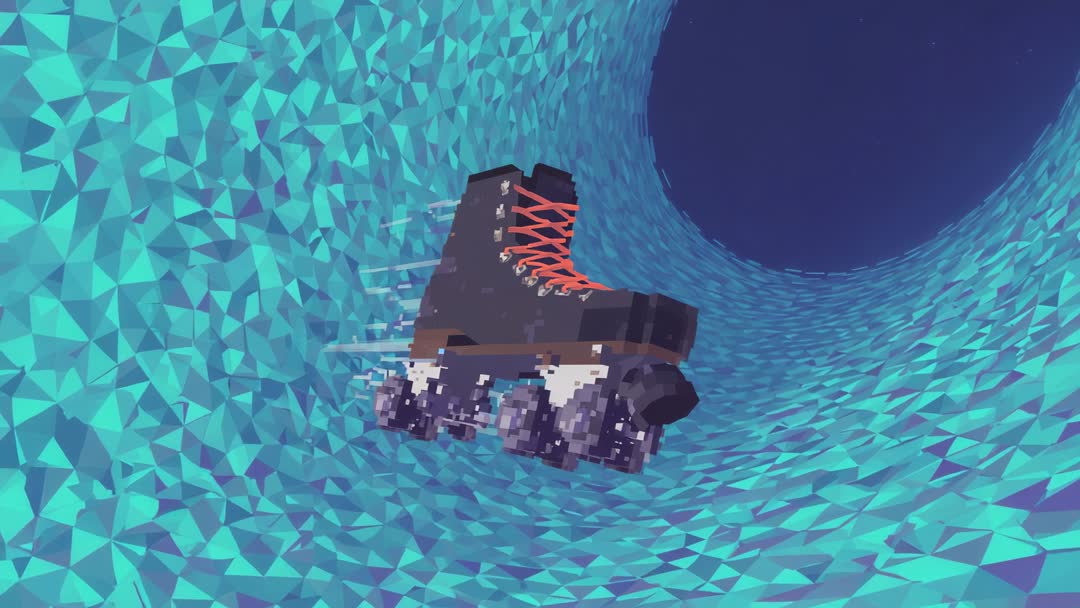 - Rolling quad skate spiraling through faceted teal tunnel toward dark void, leaving pixel trail