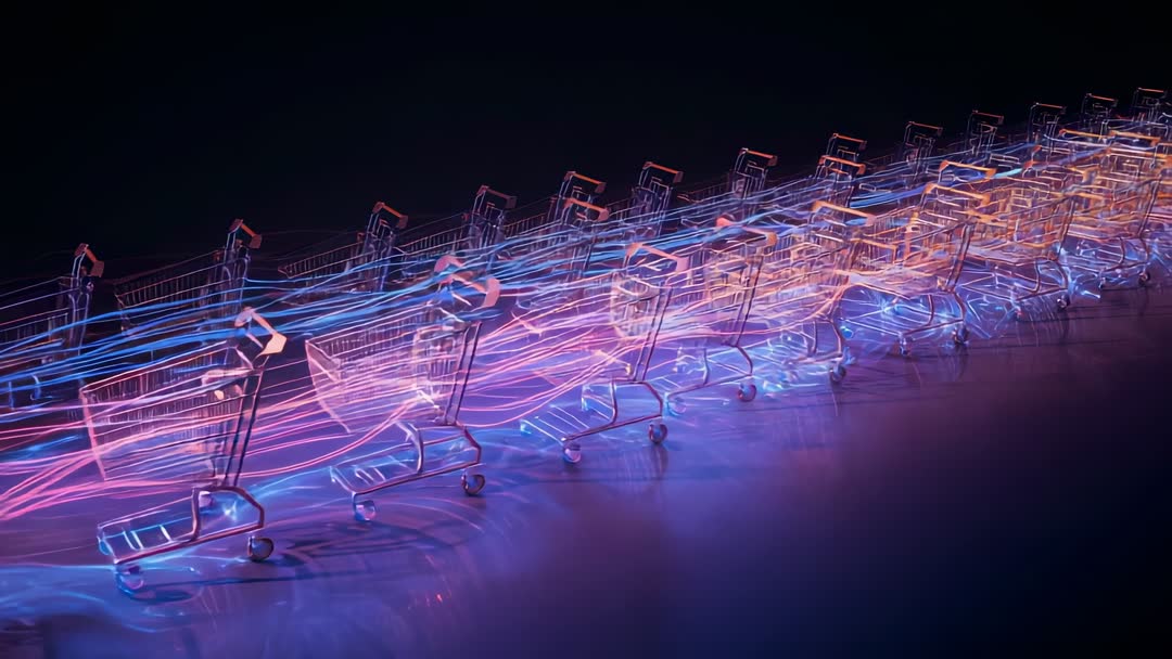 AI Generated Image. Footage featuring rolling shopping carts creating neon light trails across glossy floor, combining motion blur, LED streaks, and chrome reflections. Camera panning capturing rhythmic repetition and implied velocity, producing futuristic retail aesthetic. Color palette leaning toward electric blue and magenta, offering high contrast for striking visual impact. Suitable for overlaying bold typography, product shots, or UI animations; useful as hero background, intro sequence, commercial spot, social media ad, or editorial illustration for retail technology and e-commerce trends. File working well for looping, slow-motion breakdowns, speed ramps, and color grading to match brand identity.