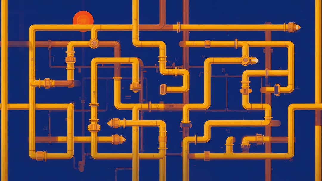 AI Generated Image. Showing rolling orange sphere navigating complex network of welded pipes, joints, elbows, and fittings against deep blue backdrop. Presenting seamless loop motion ideal for use as background in tech and industrial videos, website hero banners, and social media ads. Suggesting data network, fluid flow, pipeline transport, and infrastructure concepts for corporate presentations and explainer videos. Providing high-contrast color palette and clear negative space for overlaying text, logos, and call-to-action graphics. Offering AI-generated stylized geometry for modern, abstract visual identity and motion design projects. Recommending use as looping MP4, animated background, or motion graphic element in presentations, product demos, and advertising campaigns.