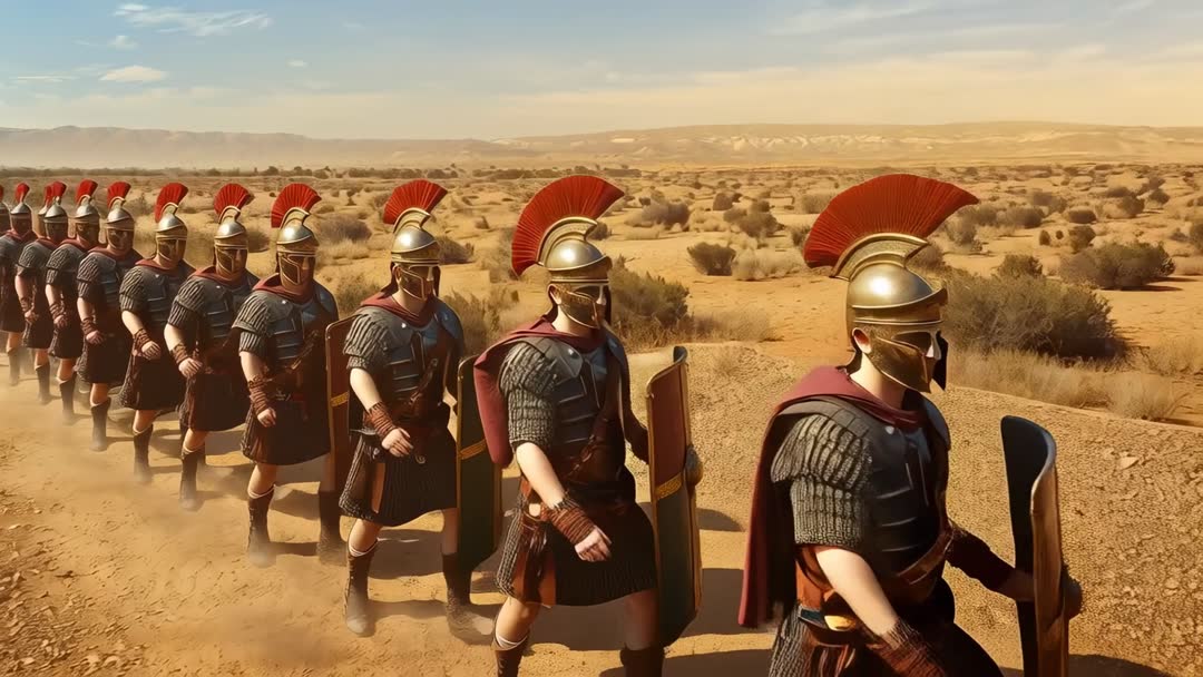AI Generated Image. Video showing Roman legionary column marching across sunlit arid plain, soldiers wearing bronze helmets with red plumes and leather armor, carrying rectangular shields while dust trails behind. Composition emphasizing repetition and depth, with low-angle perspective highlighting disciplined formation and rhythmic movement against barren landscape and distant hills. Color palette favoring warm golden tones and high contrast for cinematic impact. Use for documentary opener, history channel promo, museum exhibit loop, educational explainer about Roman military tactics, book or ebook cover for historical fiction, game trailer or cinematic cutscene, promotional material for reenactment events, travel or archaeology article hero visual, background for lecture slides or timeline graphics. Clip leaving negative space for overlay text and titles, suitable for slow-motion or speed-ramped edits and cinematic color grading.
