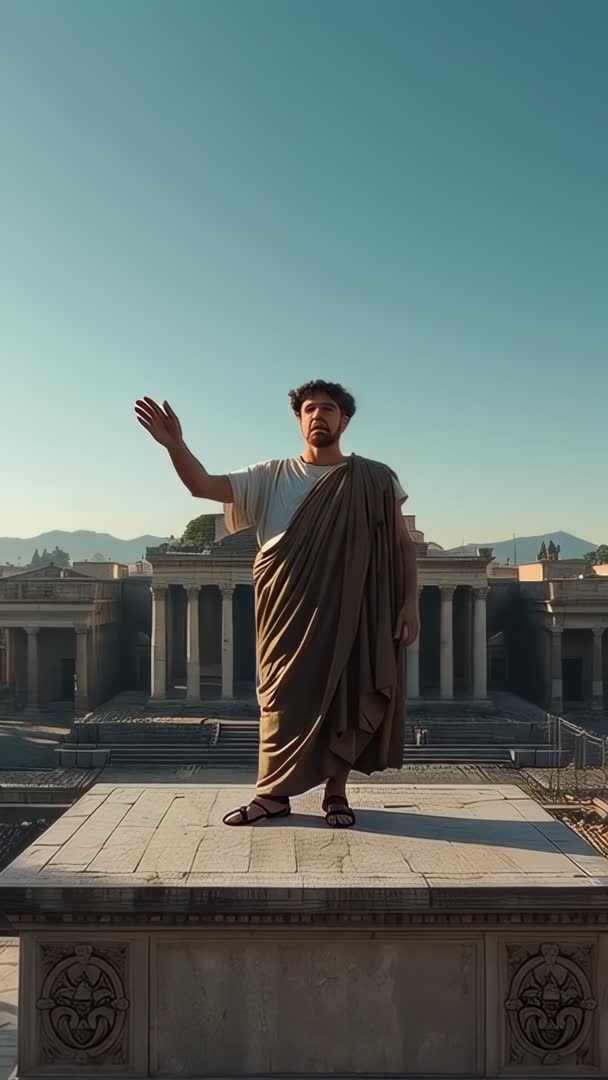AI Generated Video. Vertical video showing male orator in toga standing on pedestal before neoclassical colonnade, raising right arm while delivering passionate speech. Scene featuring warm golden hour light, deep blue sky, strong architectural lines and ample negative space above head for titles or captions. Serving historical reenactment clips, classical theater trailers, educational videos on Roman rhetoric, museum exhibit promos, political speech metaphors and corporate leadership campaigns. Suited for social media stories, mobile ads, vertical web banners, museum kiosk displays and background footage for podcasts and presentations. Recommending slow push-in or subtle dolly move, cinematic color grade, voiceover or period music to enhance dramatic impact. Placing captions or lower-third over sky area to preserve subject silhouette and maintain legibility.