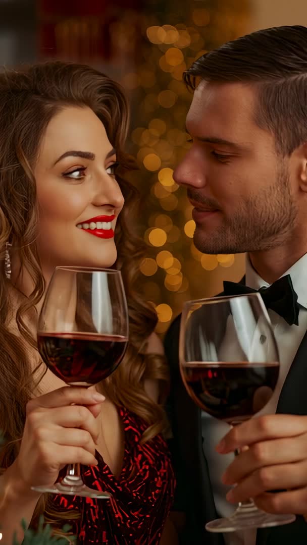 AI Generated Image. Close-up vertical video capturing couple clinking red wine glasses against warm bokeh lights, showcasing intimate romantic connection and elegant evening attire. Scene highlighting smiling woman in red dress and man in tuxedo sharing slow toast while exchanging affectionate looks. Mood conveying warmth, luxury, celebration, and timeless romance. Camera focusing on facial expressions and wine motion, creating cinematic lifestyle moment. Perfect for promoting wine brands, restaurant reservations, hotel holiday packages, upscale bar events, Valentine and anniversary campaigns, dating app creative, cinematic film b-roll, lifestyle blogs about date night, social media reels and TikTok ads, wedding proposal and engagement montages. Ideal for vertical social platforms, marketing reels, hero headers on mobile sites, short-form ads, background for voiceover. Suggested edits include color grading toward warm gold tones, adding subtle slow-motion for glass clink, and overlaying elegant typography for promo messaging.
