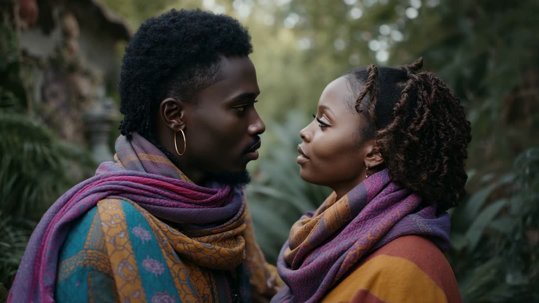 AI Generated Image. In a tranquil forest clearing, a couple stands closely, draped in vibrant scarves, creating an intimate connection against a backdrop of lush foliage. This video highlights themes of romance and unity, framed within the beauty of nature. The moment conveys warmth and elegance, ideal for projects celebrating love, diversity, and natural settings. Perfect for relationship blogs, fashion presentations, or cultural diversity promotions.