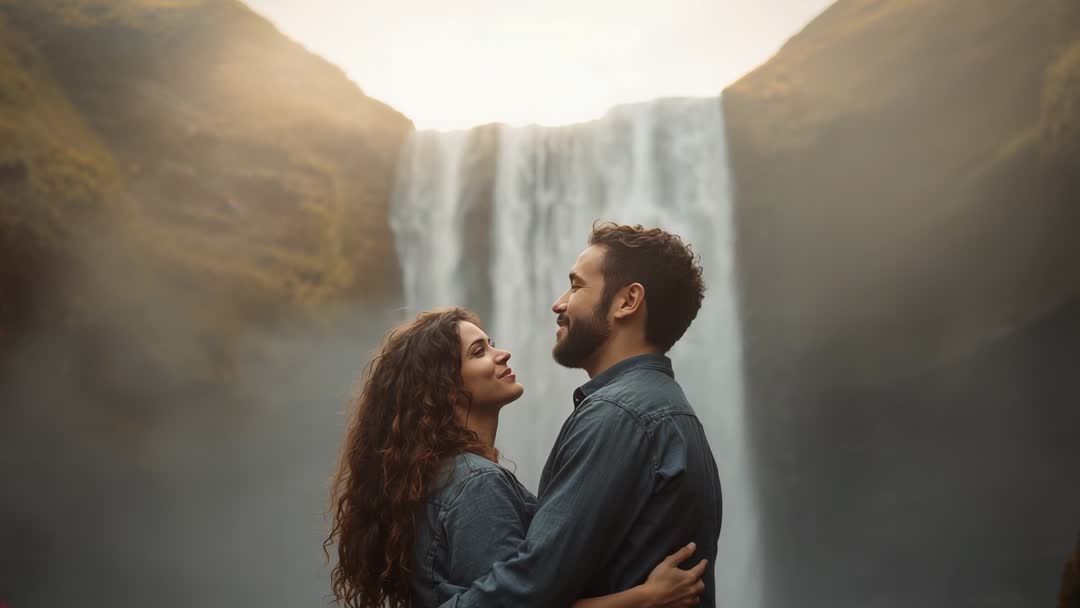 AI Generated Image. Showing romantic couple embracing while dramatic waterfall cascading down mossy canyon cliffs, mist rising and warm backlight creating cinematic glow. Featuring denim-clad partners sharing intimate moment, framing foreground against expansive natural backdrop. Suitable for travel and tourism campaigns, romantic lifestyle content, adventure blog headers, social media reels, wedding or honeymoon promotions, and mindfulness or wellness storytelling. Advising wide aspect usage for hero banners, recommending slow-motion sequencing for emotive video edits, and suggesting color grading to enhance golden tones and ethereal misty atmosphere.