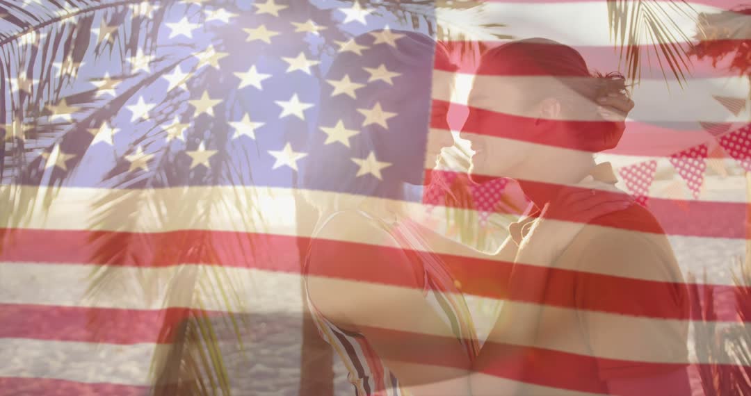 This warm, inviting scene shows a couple embracing on a sunlit beach with an overlay of the American flag, evoking themes of romance and patriotism. The palms and festive bunting create an idyllic vacation atmosphere. Perfect for marketing travel promotions, romantic escape packages, or Americana-themed celebrations.