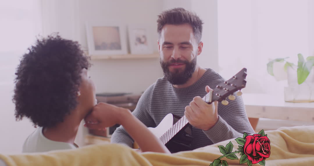 A Caucasian man engaging in a heartfelt guitar session with his African-American partner. Seated on a cozy sofa, they enjoy an intimate moment filled with music and harmony. Animation of beautiful roses adds a touch of romance to the scene. This is ideal for concepts related to love, diverse relationships, leisurely activities at home, or romantic advertisements.