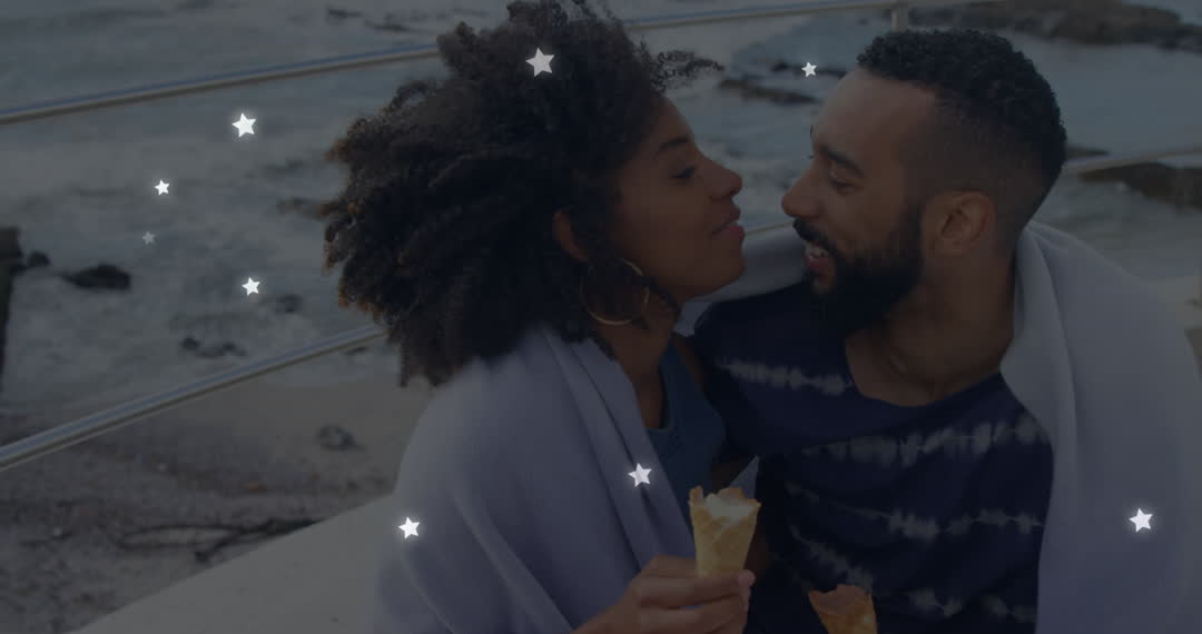 Romantic and cozy seaside moment featuring a couple enjoying ice cream, wrapped in blanket, with animated stars adding whimsy. Ideal for advertising romance-themed products, travel agency promotions, or social media content related to couples and intimacy.